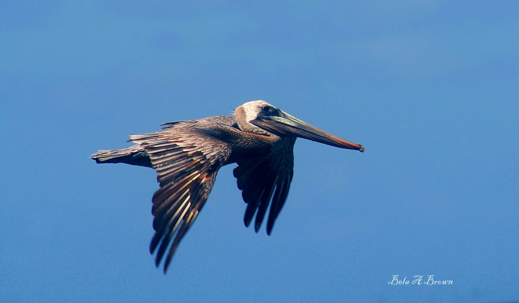 After observing the bird for twenty minutes, my curiosity was piqued by the peculiar shape of its bill. This eleven-inch pouched bill appears unusual, yet I rarely saw the pouch open for an extended period. Contrary to popular belief, the pouch doesn’t store food; it functions more like a fishing bucket attached to the throat. Fascinatingly, while feeding, it can hold up to three gallons of water—three times the capacity of its stomach. Although this water is expelled quickly, the bird faces threats from seagulls and frigatebirds that frequently swoop in to snatch the fish within. This leads to the question: why possess such a large pouch? “Dear Mr. Pelican, are your eyes bigger than your belly?”