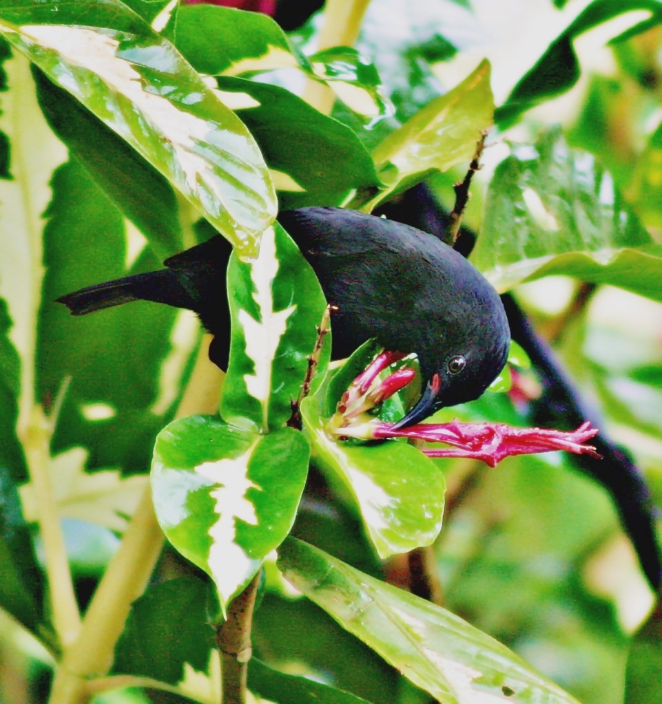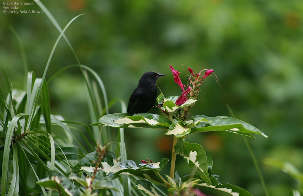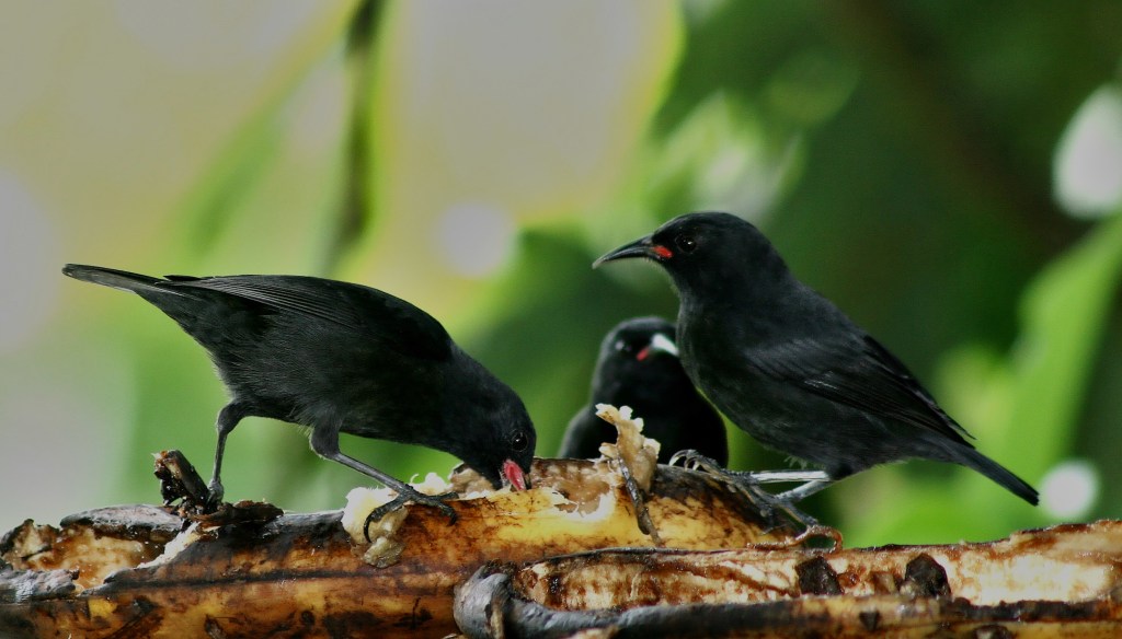 In Grenada and St Vincent, there are two color morphs living together—the popular “yellow breast” and a mostly black morph. Interestingly, on both islands, these morphs are found in different rainfall areas: the drought-resistant “yellow breast” thrives in dry places, while the “black morph” is mainly in wetter areas like rainforests. Since I live near the rainforest, I mainly see the black morph. Every day, many black bananaquits flock to our banana feeder, using their sharp beaks to pierce the banana skins and reach the sweet flesh within. They have a special affinity for banana blossoms and I often spot them hanging upside down, sipping the nectar from the large, tear-shaped flowers.