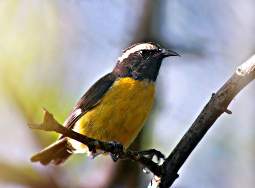 The Bananaquit is a creature of the American tropics where bananas thrive and blossoms abound throughout the year. Notably skittish and always on the move, this tiny bird is often seen feasting upon a banana tree, or darting from flower to flower, hopping and probing with quick, nervous movements, in search of sweet, precious nectar.