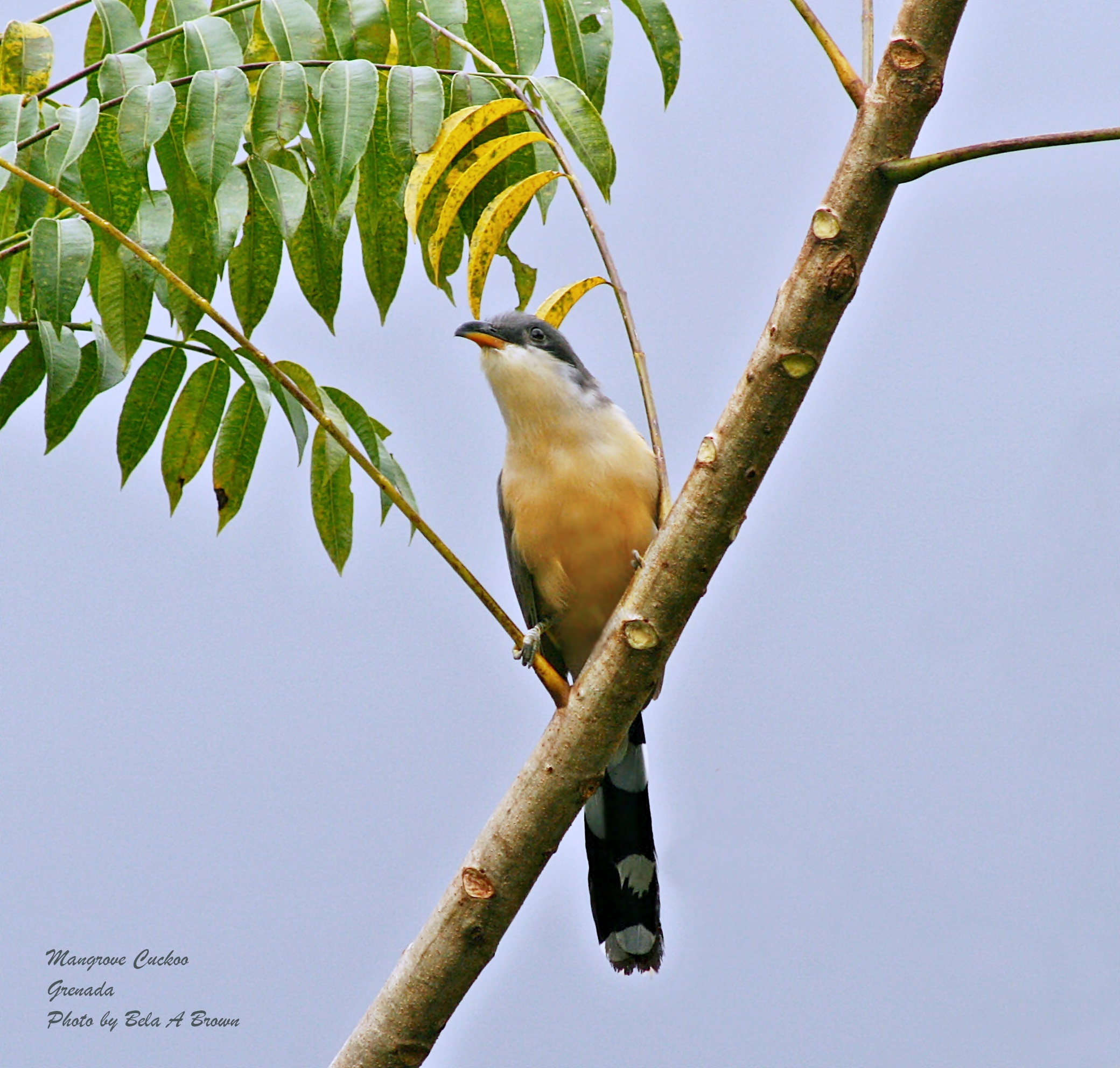 The Mangrove Cuckoo (Coccyzus minor) is a stunning medium-sized bird with yellowish-peach-coloured underparts, a long dark tail with white tips, a greyish-brown back, and a blackish face mask. Its bill is two-toned, black on the top and orange-yellow on the bottom with a dark grey tip. The eye ring changes from grey in breeding season to bright yellow the rest of the year. The Mangrove Cuckoo can be mistaken for the Yellow-Billed Cuckoo, especially on islands where they overlap, but the Yellow-Billed does not have a black face mask and has white underparts instead of peach. Also, its call is higher and faster than the Mangrove Cuckoo’s.